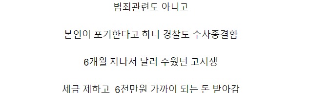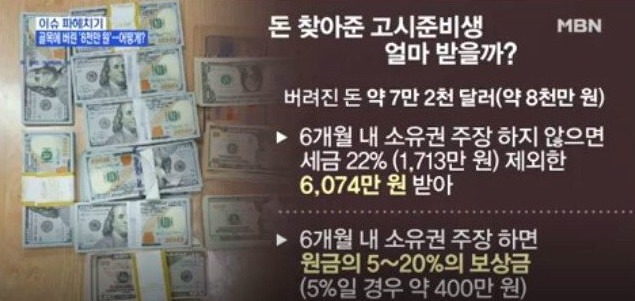 고시원생이 잃어버린 돈을 경찰서에 신고했지만 소유자가 소유권을 주장하지 않아 세금을 제한 나머지 돈을 가지게 되었기 때문이다.