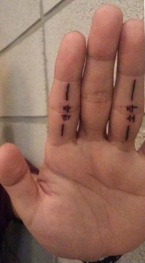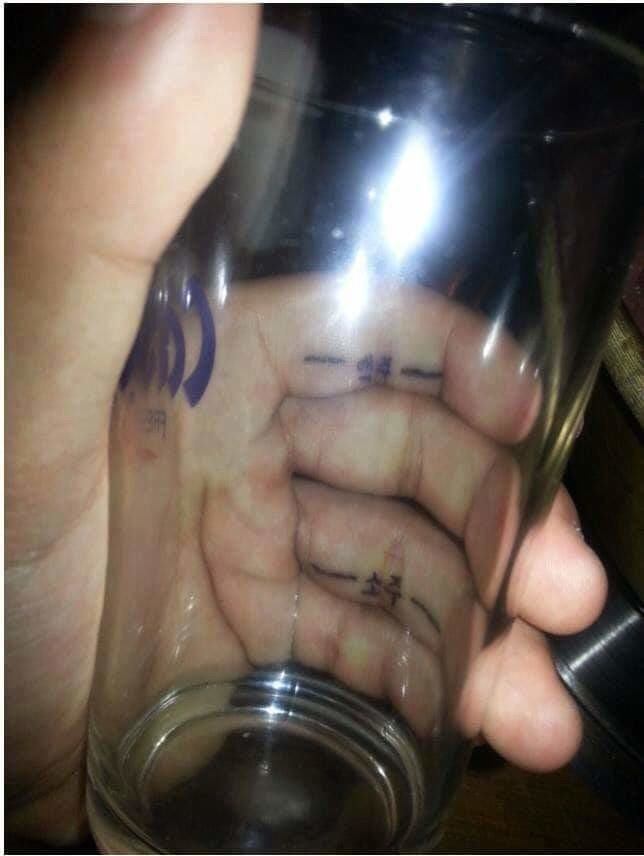 프로알콜러의 충격적인 타투 술을 좋아하는 한 남자의 타투에 네티즌들의 이목을 끌었다. 이 남성은 평소 술을 좋아해 두번째 손가락과 네번째 손가락에 다음과 같은 타투를 새겼다. 타투만으로 남성의 의도를 알 수 없다면 다음 사진을 보자. 바로 소맥(소주+맥주)의 황금 비율을 표시하기 위해 타투를 새긴 것이다. 네티즌들은 신박하긴 하지만 타투로 하기에는 좀 아닌것 같다는 반응이 많았다.