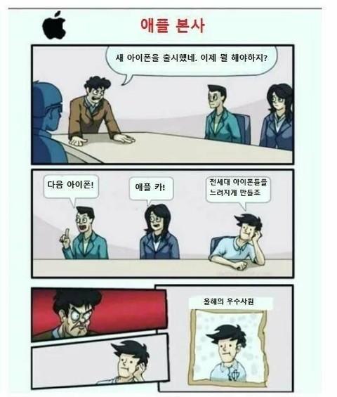 애플 올해의 우수사원 최근 애플의 아이폰이 업데이트 후 속도가 저하되었다는 유저들이 많다. 이에 애플사는 "아이폰이 추위에 불시에 다운되지 않도록 아이폰 프로세서 속도를 느리게 하는 기능을 아이폰6와 6S, SE, 아이폰7에 탑재해 출시했다"며 속도를 저하시킨 것을 인정해 크게 논란이 되고 있다. 이같은 상황으로 아이폰을 사용중인 한 소비자는 애플 올해의 우수사원이라는 웃지못할 웹툰을 그렸다.