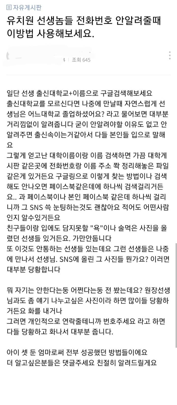 이 네티즌은 자신이 아이 셋을 둔 엄마라고 밝히며 유치원 선생님의 전화번호를 알아내는 방법을 적었다.