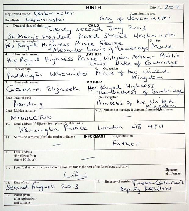 영국 조지왕자 출생신고서 영국 조지왕자의 초간단 출생신고서가 화제다. 이름: 조지 알렉산더 루이스 캠브리지 공자 전하 아버지 이름: 윌리엄 아서 필립 루이스 케임브리지 공작 전하 아버지 직업: 영국 왕자 어머니 이름: 캐서린 엘리자베스 케임브리지 공작 부인 전하 어머니 직업: 영국 왕자비 집주소: 켄징턴궁