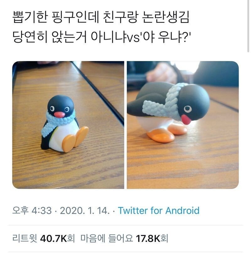 그것은 바로 자세에 따라 느낌이 너무 다른 피규어였기 때문입니다. 가만히 앉혀 놓으면 귀여운 핑구지만 두 발로 서면 마치 우는 사람을 놀리는 듯한 밉살스러운 모습이 연출되기 때문입니다. 이런 때아닌 논쟁에 누리꾼들은 "핑구 목도리를 보면 앉은 게 맞지" "핑구 물개 편 진짜 무서웠는데" "그냥 두 가지 매력으로 즐겨 바보들아" 등의 반응을 보였습니다.