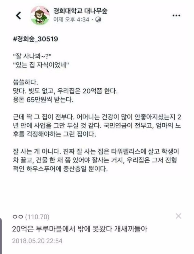 한 SNS커뮤니티에 자신의 집은 금수저가 아니라 하우스 푸어 중산층이라며 올린 글이 흙수저 누리꾼들의 분노를 사고 있다.