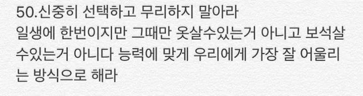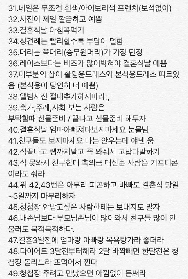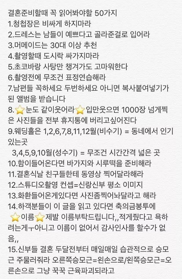 결혼 준비할 때 참고할 50가지 결혼을 준비할 때 꼭 읽어봐야 하는 50가지 현실 조언이 화제가 되고 있다. 이미 결혼을 해 본 사람들은 이 50가지 의견에 대해 대부분 공감하는 반응을 보였다. 결혼 준비를 앞두고 있다면 다음 사항을 읽어보자.
