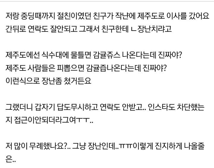 제주도로 이사간 친구가 연락을 끊은 이유 한 네티즌은 중학교때 친구가 제주도에 이사를 간 후 자신과 연락이 끊겨겼다며 고민글을 남겼다. 그 이유가 자신이 장난을 쳤기 때문이라고 추측하면서도 그냥 장난인데 진지한 친구가 이해가 안된다는 반응을 보였다. 네티즌들은 '분명 저 장난을 한두번 한 게 아닐 것같다', '평소에 쌓인 게 많았을 것 같다'는 의견을 보였다.