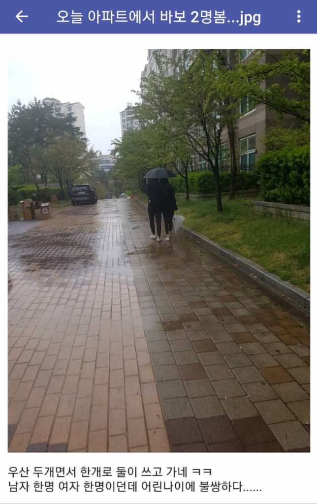우산이 두개나 있는데 한개로 둘이 쓴다니 정말 바보같은 행동이네요 휴..