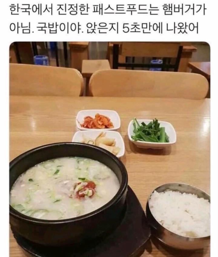 국밥은 미리 푹 끓여놓고 손님이 오면 바로 제공되어 빠르게 먹을 수 있는 점에 패스트푸드가 아니냐는 의견이 나왔다.