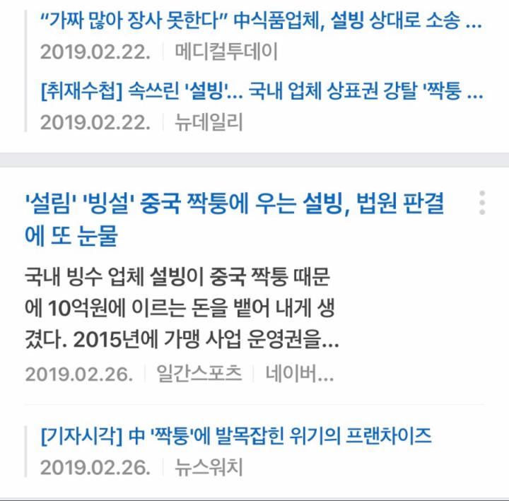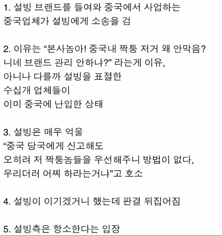 중국에 10억 물어주게 생긴 설빙 설빙 브랜드를 들여와 중국에서 사업하는 중국 업체가 설빙에게 소송을 걸어 논란이 되고 있다. 소송된 이유는 설빙의 짝퉁 브랜드들을 막지 못해 손해를 입었다는 것이다.