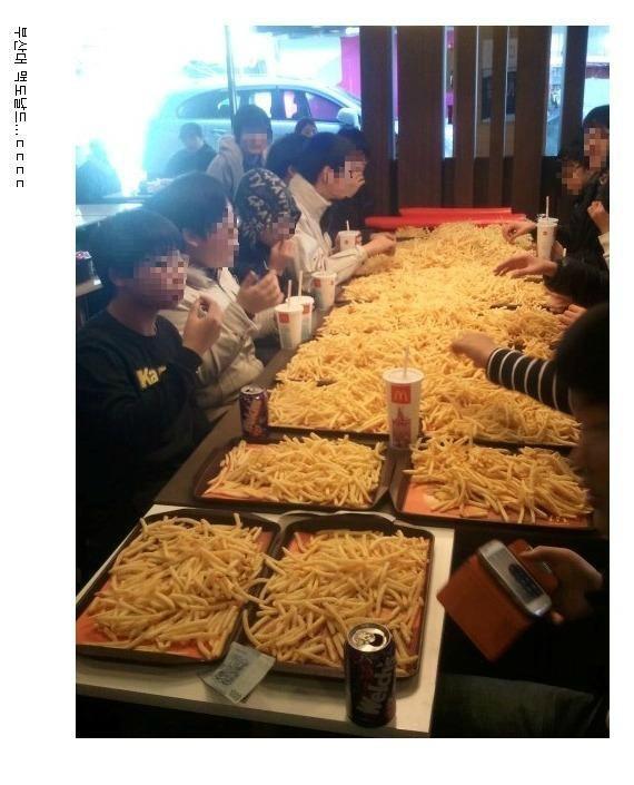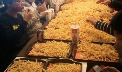 이 학생들은 모든 쟁반에 감자튀김을 쏟아 넣고 단체로 먹고 있어 이 사진이 크게 이슈가 된 바 있다.