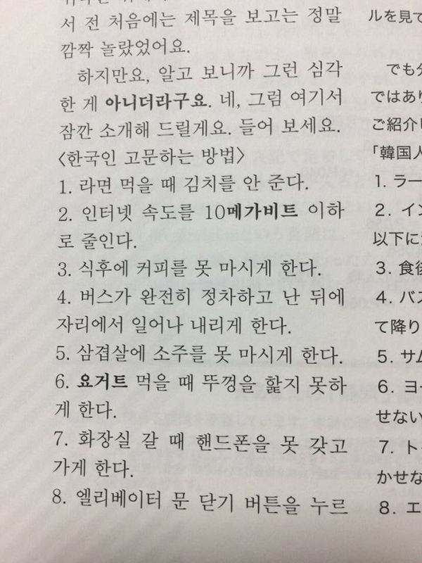 한국인 고문하는 방법은 라면 먹을 때 김치를 안주거나 인터넷 속도를 10메가비트 이하로 줄이는 등의 방법이었다.