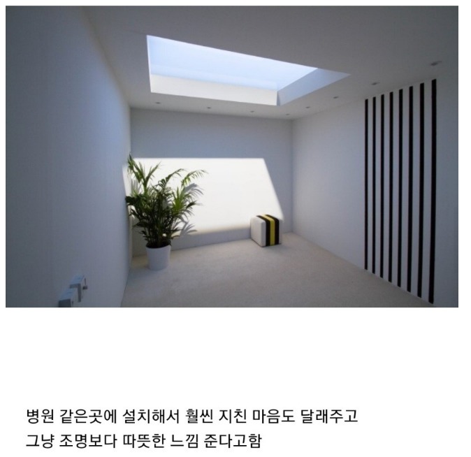 바로 인공적으로 태양의 빛을 만드는 인공 태양 조명 개발에 성공한 것입니다. 일반 조명보다 훨씬 깔끔하고 편안한 분위기를 주는 것 같네요.