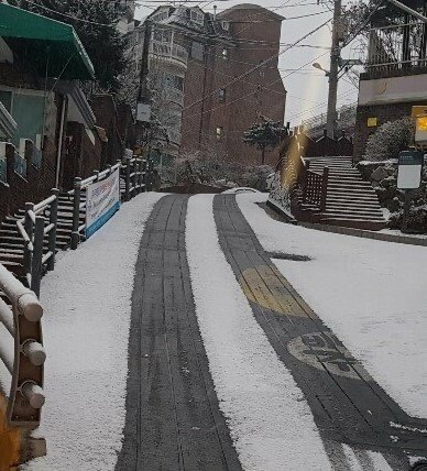 바로 도로가 얼지 않게 차들이 다니는 부분에 열선을 깔아 눈이 어는 것을 방지한 것입니다.