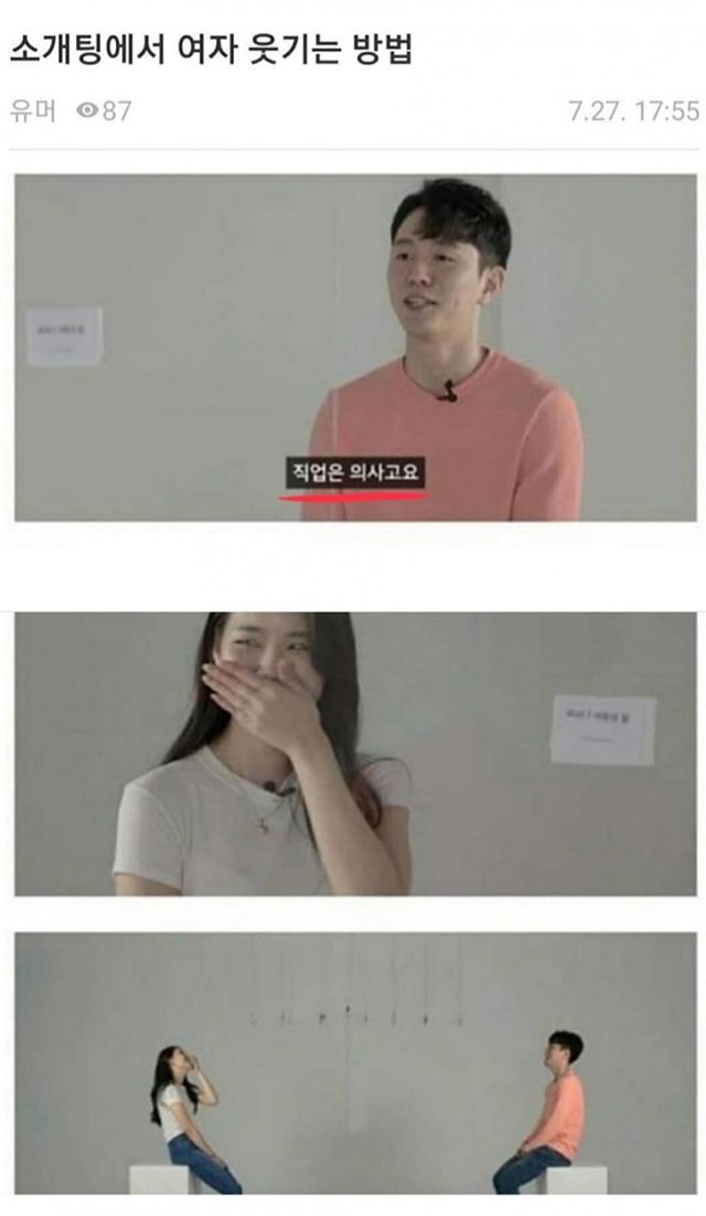 정답은 "직업은 의사구요"였다. 이 실험에 참여햔 소개팅녀들은 죄다 함박 웃음을 감추지 못했다는 후문이다.