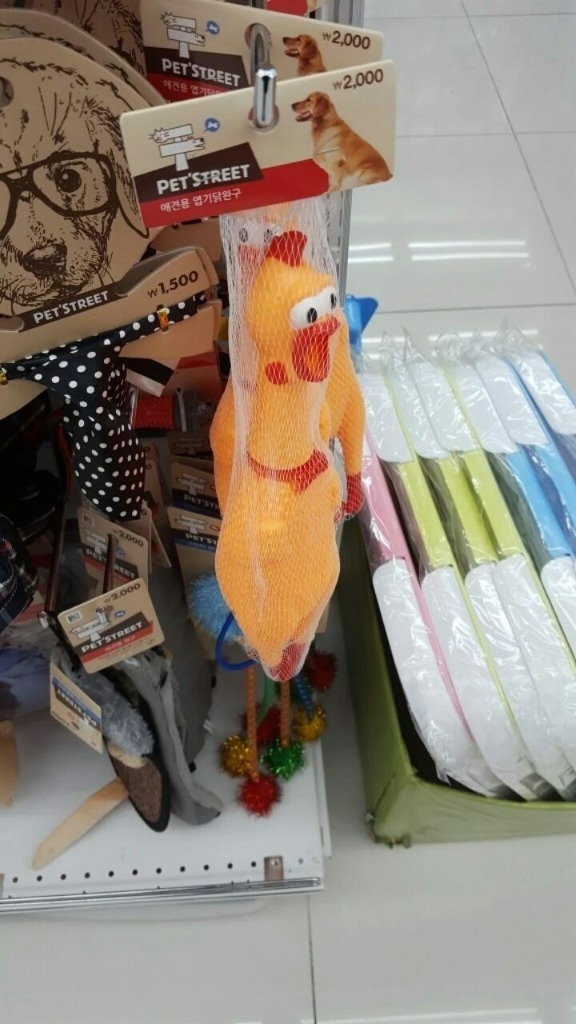 다이소에서 가장 많이 듣는 말 1위에 오른 "꼬아아아악!"은 다이소에서 판매 중인 애견용 엽기 닭완구 소리를 뜻한다.