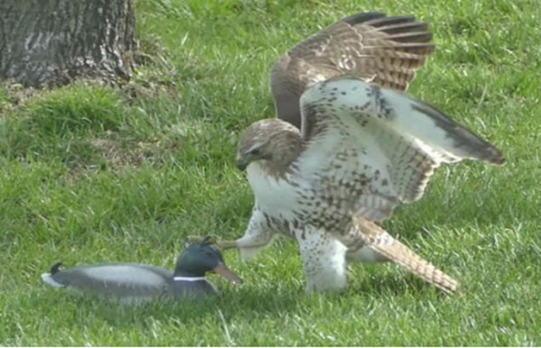 매의 공격을 아무런 저항 없이 묵묵히 당하는 오리. 하지만 상처를 입을 공격에도 전혀 반응이 없습니다 .그 이유는 오리가 바로 나무라서 그렇죠 ㅋㅋㅋㅋ 나무 오리를 처음 봐 매가 매우 당황하는 것 같습니다.