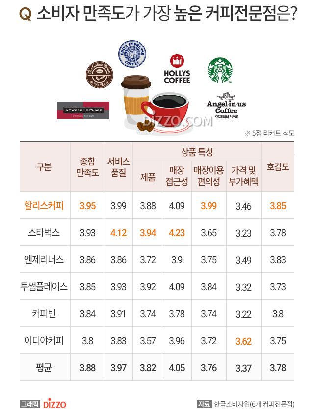 종합만족도는 소비자 만족도의 3개 부문인 서비스 품질 만족도, 상품 특성 만족도, 호감도의 중요도(가중치)를 반영한 평균값으로, 조사대상 6개 커피전문점 서비스의 종합만족도는 평균 3.88점이었다. 사업자별로는 할리스커피가 3.95점으로 가장 높았고, 스타벅스 3.93점, 엔제리너스 3.86점 등의 순이었다.