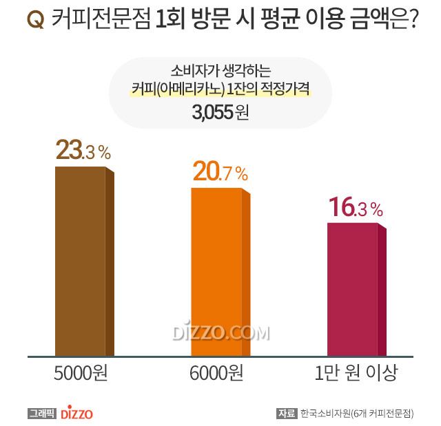 커피전문점 1회 방문 시 평균 이용 금액은 '5000원'이 23.2%로 가장 많았고, '6000원' 20.7%, '1만 원 초과' 16.3% 순이었다.