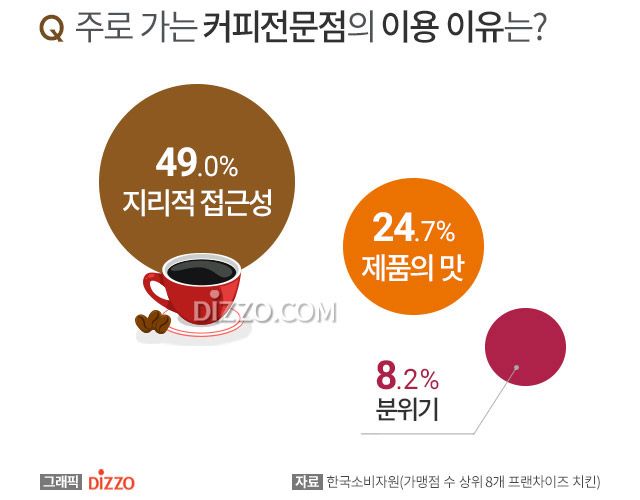 주로 가는 커피전문점을 이용하는 이유는 '지리적 접근성'이 49.0%로 가장 많았다. 이어 '제품의 맛'이 24.7%, '분위기'가 8.2% 등이었다.
