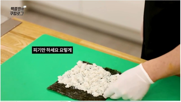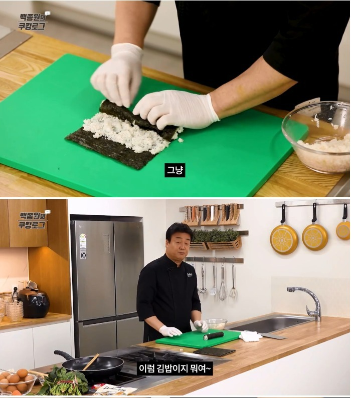 백종원은 그냥 김에 밥을 펴고 말면 김밥이 아니냐며 뚝딱 만들어 냅니다.