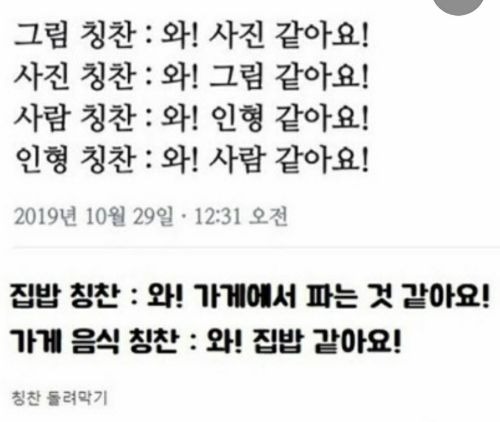 이를 본 누리꾼들은 "??? 진짜네 칭찬이 이렇게 성의가 없었나?" 등의 반응을 보였습니다.