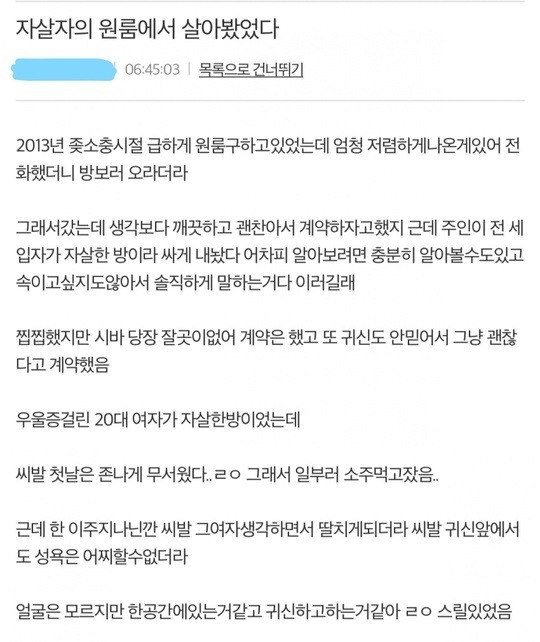 누군가 자살한 집에서 사는 누리꾼.