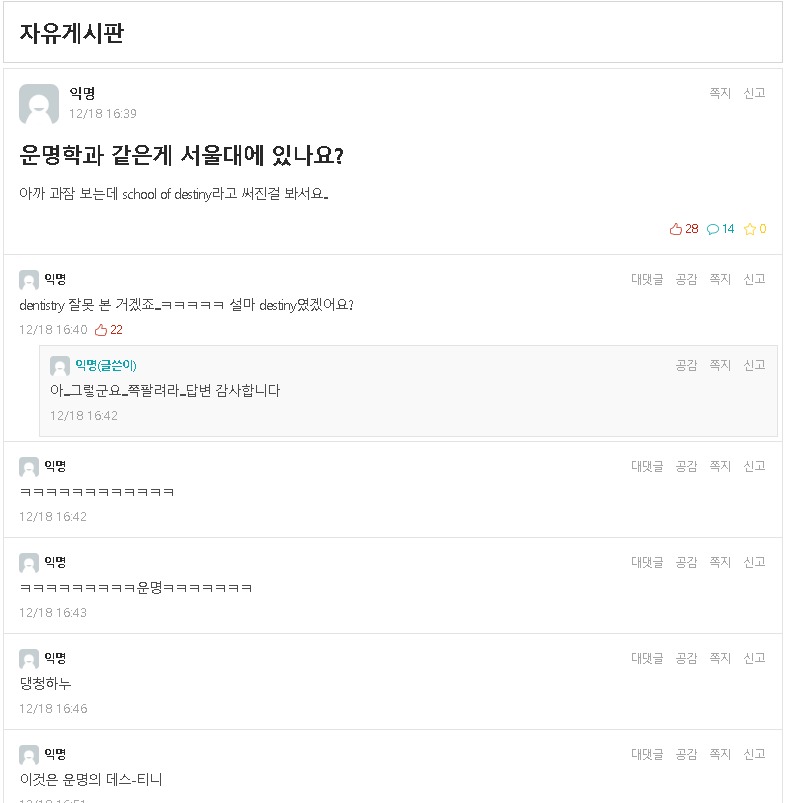 자신이 길을 걷다가 서울대 Destiny, 서울대 운명학과를 본 것 같다고 실제로 있는 학과냐고 질문을 올린 한 서울대생. 이에 다른 친구들이 dentistry(치대)를 잘 못 본 것 같다고 지적을 했습니다. 다소 황당한 서울대생의 질문을 본 누리꾼들은 "원숭이도 나무에서 떨어진다" "지잡대 수준의 질문을 하네" "댕청하니 귀엽구만 뭘" 등의 반응을 보였습니다.