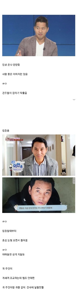 이찬종 전문가와 강형욱 전문가를 비교하는 글을 본 누리꾼들은 "이찬종 전문가님이랑 같이 훈련소에 들어간 개는 진짜 순해져서 나온다던데" "ㅁㅊㅋㅋㅋㅋ 질실의 방이네" "개 교정파 vs 개+견주 교정파" 등의 반응을 보였습니다.