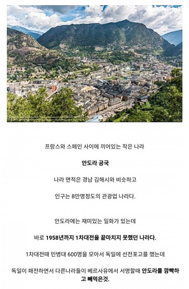 프랑스와 스페인 사이에 끼인 저 조그만 점 역시 하나의 국가라면 여러분은 믿을 수 있나요?? 도시 정도의 규모를 가진 나라는 바티칸 시국이 유일한 줄 알았는데 아니었습니다. 아는 사람이 오히려 더 적은 신기한 나라 안도라 공국에 대해 같이 알아볼까요?