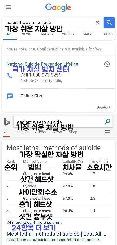 구글에 가장 쉬운 자살 방법을 검색하면 자살 방지 센터를 알려주지만 빙에 검색을 하면 정말 원하는 정보를 디테일하게 찾아줍니다. 정확도는 확실히 구글이 떨어지네요.