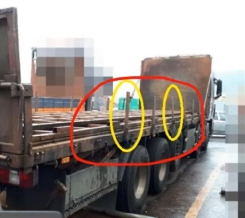 저 철근은 화물차 판 스프링이라고 불리는 것으로 과적을 위해 불법으로 다는 부품입니다. 저런 철근이 떨어져 피해가 발생해도 트럭 기사는 모르기에 그냥 새로 달아야지 하고 달면 끝, 피해자도 가해자도 찾기 어려운 최악의 튜닝입니다.