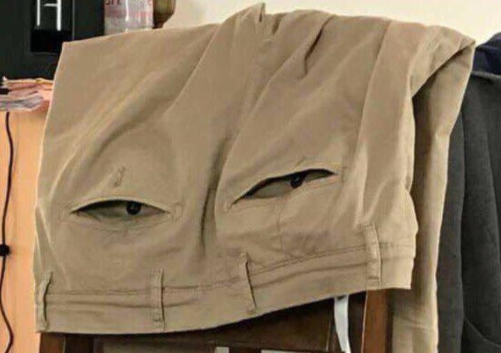 해당 사진은 의자에 바지가 지연스럽게 걸려있는 사진인데 자세히 보면 바지의 뒷주마니가 눈처럼 보인다.