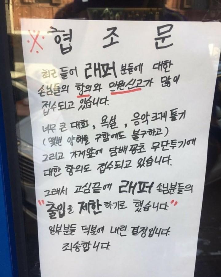 홍대 노'래퍼'존 등장 홍대의 한 가게에 노'래퍼'존이 등장이 이슈가 되고 있다. 노래퍼존이란 래퍼들의 출입을 금지하는 것을 말한다. 노키즈존에 이어 노래퍼존의 등장으로 많은 네티즌들이 흥미로운 반응을 보였다. 일부 사람들의 민폐 행동으로 출입 금지 제한하는 것이 과연 맞는 것인지에 대한 논란이 팽배하다.