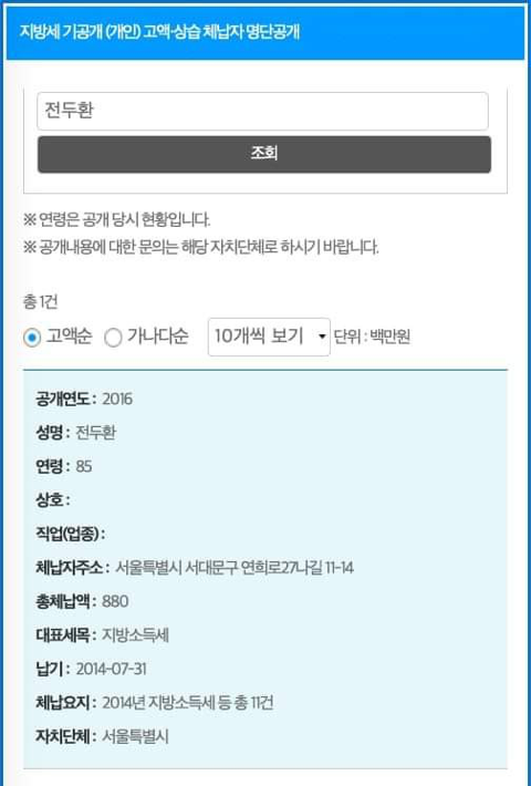 전두환 29만원 근황 전재산이 29만원이라는 전두환 전 대통령의 근황이 화제다. 서울시가 공개한 1000만 원 이상 고액‧상습 지방세 체납자 명단에 따르면 전두환 전 대통령이 지방세로 8억 8천만원을 체납한 것으로 밝혀졌다. 이에 네티즌들은 빨리 세금을 내도록 해야한다며 분노했다. 그밖에 체납자 명단은 사이트 (http://finance.seoul.go.kr/archives/38049?tr_code=short)에서 확인할 수 있다.