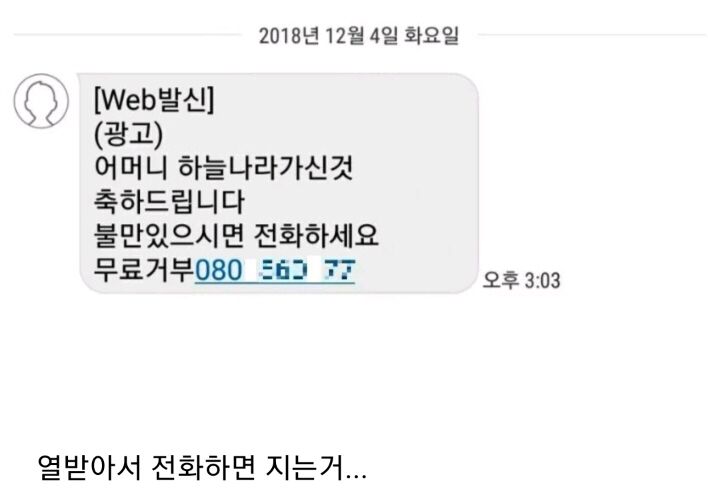 이런 문자를 보면 절대 전화하지 말아라 날마다 새로운 수법을 사용하는 스팸. 불쾌한 내용을 문자로 남겨 전화를 하게 만드는 신종 스팸 문자가 있다. 이 문자를 본 네티즌들은 '도가 지나치다.', ' 이건 좀 아니다. 인성이 잘못됐다.'며 격분했다. 이런 스팸 문자를 받았다면 절대 전화하지말고, KISA 불법스팸대응센터 ( https://spam.kisa.or.kr/integration/main.do )에 신고하자.