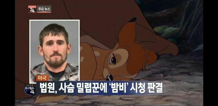 미국에서 사슴 밀렵꾼에게 내려진 놀라운 판결 미국에서 사슴 밀렵꾼에게 내려진 판결이 화제를 모으고 있다. 미국 법원은 사슴 밀렵꾼에게 애니메이션 '밤비'를 시청하는 판결을 내린 것. '밤비'에서 주인공 밤비의 엄마 사슴은 밀렵꾼에게 총을 맞아 죽는다. 이에 애니메이션을 통해 교훈을 주기 위해 이같은 판결을 내린 것으로 추측하고 있다.