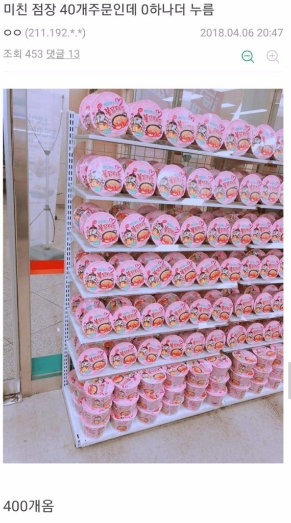 까르보 불닭 발주를 40개 해야 하는데 실수로 0을 하나 더 적어 400개가 온 웃픈 상황.