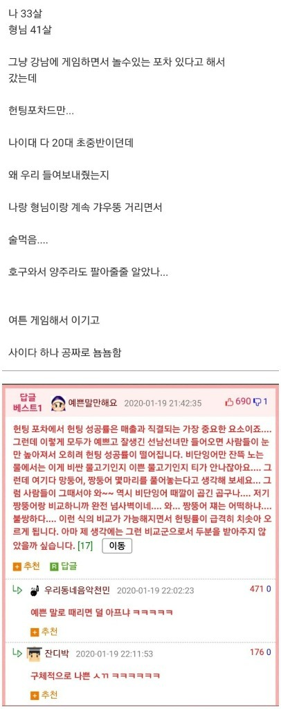 20대 남녀가 서로의 짝을 찾기 위해 찾아오는 헌팅 포자, 클럽보다 싸고 확실하게 이성을 만날 수 있기 때문에 지갑이 가벼운 대학생들이 많이 찾는다. 이런 헌팅 포차에 놀러 간 30대와 40대 아저씨의 후기 글에 달린 댓글이 누리꾼들의 뜨거운 관심을 받고 있습니다. 과연 어떤 글이었을까요?