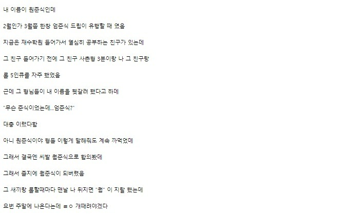 여러분은 지난 2월과 3월 4월까지 가장 유명했던 한 사나이의 이름은 아시나요? 그의 이름은 엄준식, 누리꾼들 사이에서는 -엄-으로 유명한 사람입니다. 과거 이름을 숨기고 방송을 허던 엄은 야방 도중 자신의 실명이 공개됐는데 별 거 아닌 평범한 이름이 이상하게 더 찐따같은 이미지를 줘 사람들에게 큰 웃음을 줬습니다.