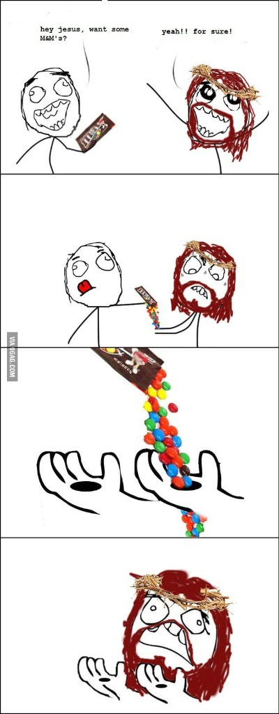 예수님은 십자가에 박히셨기에 손에 구멍이 나 작은 M&M을 손으로 받을 수 없어서 먹을 수 없다고 합니다.