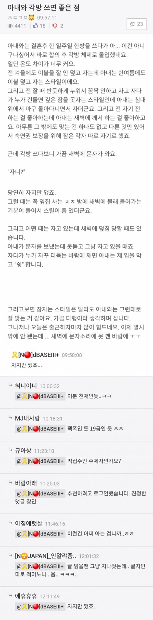 아내와 각 방 쓰면 좋은점. 한 온라인 커뮤니티에 아내와 각방 쓰면 좋은 점에 대한 글이 올라와 화제다. 글쓴이는 아내와 온도 차이때문에 각방을 쓰게 됐는데, 그로인해 부부관계가 더 좋아졌다고 한다.출처: 인터넷커뮤니티 캡처