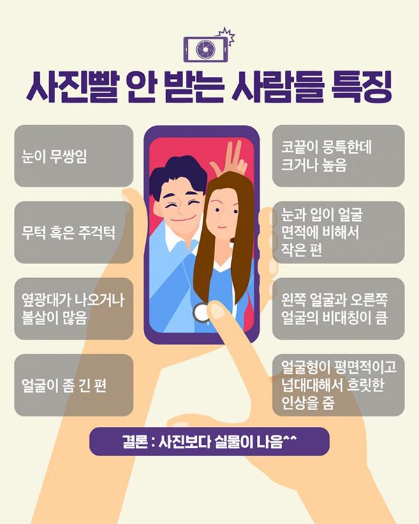 소위 말하는 사진빨 받는 나름의 노하우가 있는 것. 그러나 남들이 하라는 대로 찍어도 실물보다 사진이 더 별로인 사람들이 있다. 이처럼 사진빨이 잘 안 받는 사람들의 특징을 정리했다.