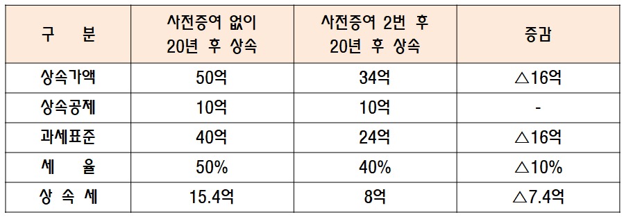 이 경우, 34억에서 일괄공제와 배우자 공제로 10억을 빼면 과세표준은 24억이 되고, 최고 세율은 40%가 적용되어 상속세는 8억 원이 나옵니다. 그냥 내버려 두었으면 15억 4천만 원의 상속세를 낼 것을, 사전증여를 통해 8억 원으로 줄였으니 절세액은 7억 4,000만 원이나 됩니다.