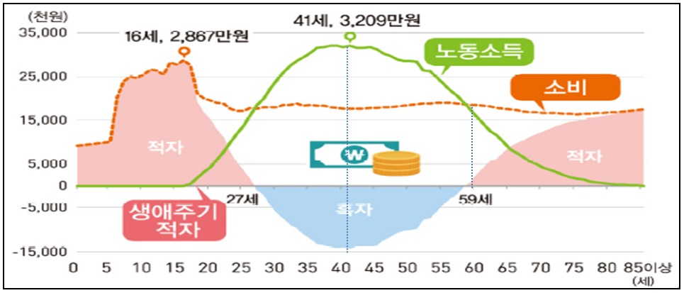 그림을 보면 소득과 소비 곡선이 표시되어 있는데, 소득은 20대 이후 쭉 늘어났다가, 41세를 정점으로 하락하는 형태를 보이는 반면, 지출은 평생 동안 계속되는 것을 알 수 있습니다. 이에 따른 적자 및 흑자 구간을 살펴보면, 소득이 없거나 적은 26세 이전에는 약 4억 6,100만 원의 적자를 기록하다가, 취업 후 퇴직에 이르는 27세에서 58세 사이에는 약 2억 9,500만 원의 흑자를 기록한 뒤, 59세 이후에는 약 3억 2,600만 원 적자로 돌아서는 모습을 보입니다.