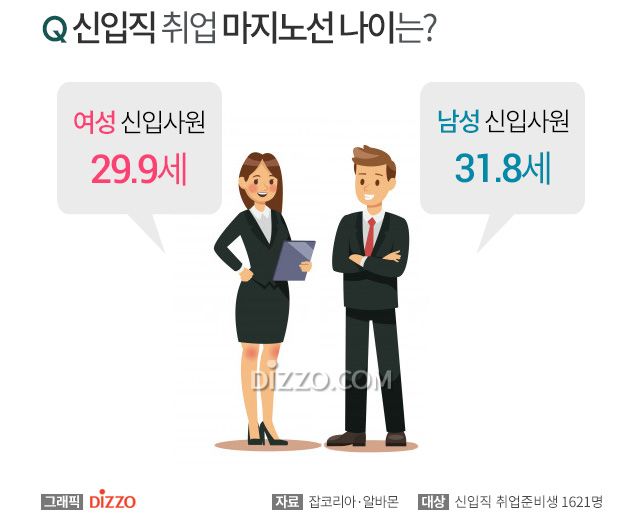 그렇다면 신입직 취업의 마지노선 나이가 있을까? 설문에 따르면 남성은 평균 31.8세, 여성은 평균 29.9세로 나타나 여성보다는 남성이 취업 마지노선을 더 높은 연령에 두고 있는 것으로 나타났다.