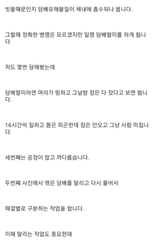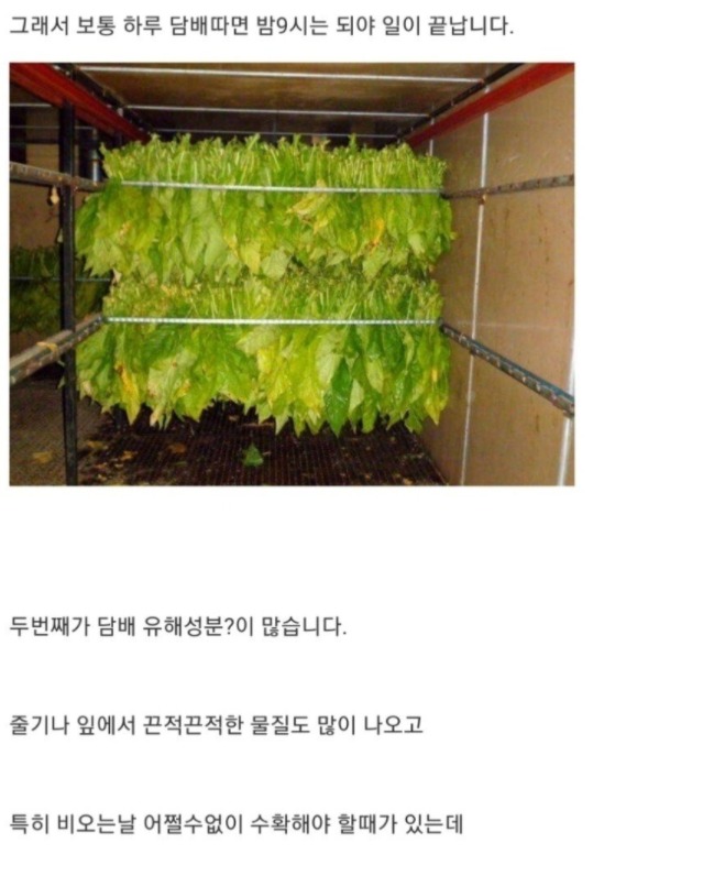 와... 다른 농사랑 다르게 담배 멀미로 머리가 어지러울 정도로 독한 농사면 엄청 힘들 것 같습니다.
