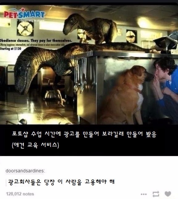 포토샵 수업 시간에 광고를 만들어 보라길래 만든 애견 교육 서비스 광고 이미지, 말하고자 하는 내용은 단순하지만 소비자의 마음을 크게 사로잡았습니다.
