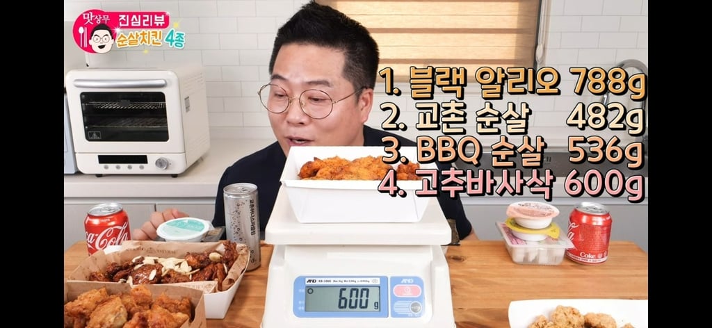 최근 가장 잘 팔리는 4종의 치킨을 비교한 결과 푸라닭의 블랙 알리오가 1등 교촌의 순살이 꼴찌를 했네요. 교촌 무게는 진짜 거의 병아리 아닐까요?