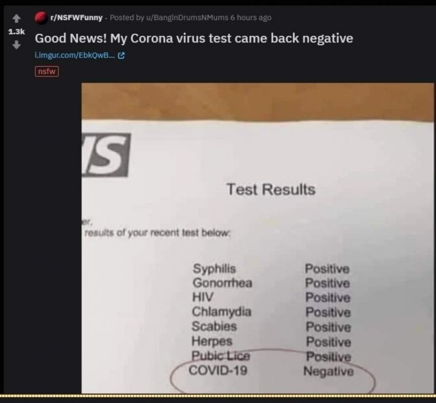 각종 성병, 에이즈까지 양성이 떴지만 불행 중 다행으로 코로나는 음성이네요 적어도 목숨은 건진 것 같습니다...