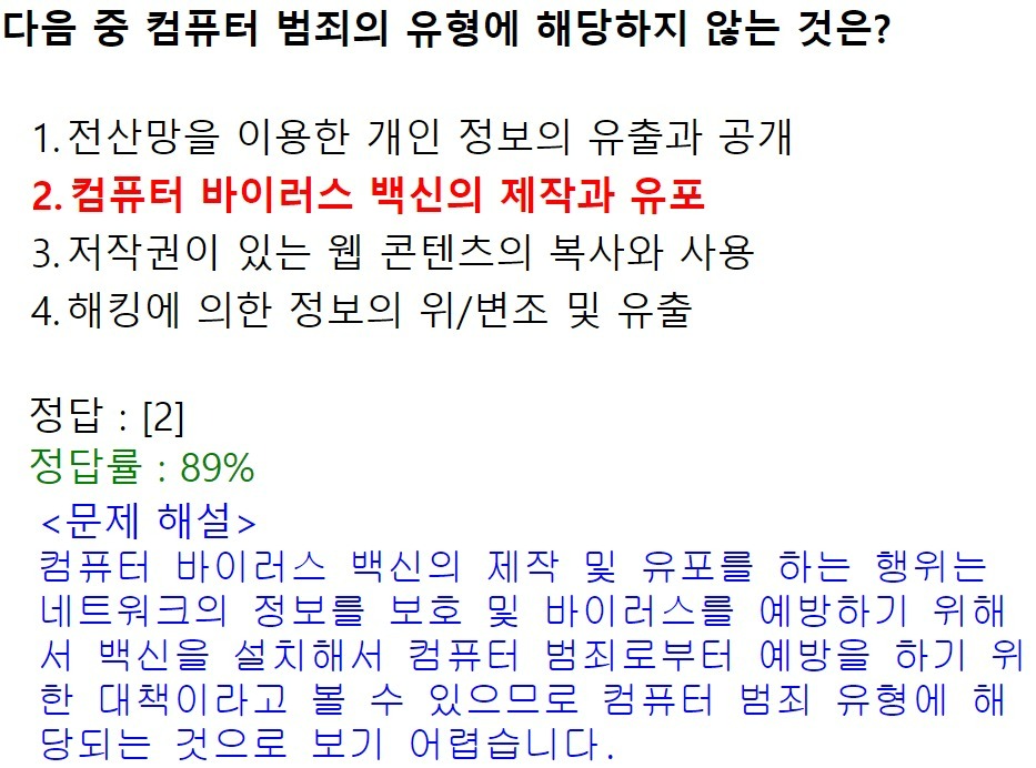 컴퓨터 범죄의 유형에 해당되지 않는 것을 찾는 간단한 이 문제의 오답률이 자그마치 11%라고 합니다.