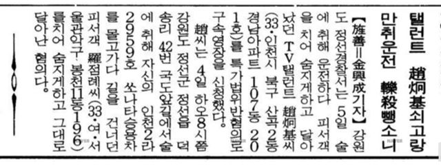 趙(조)씨는 4일 하오8시쯤 강원도 정선군 정선읍 덕송리 42번 국도앞길에서 술에 취해 자신의 인천2라2959호 쏘나타 승용차를 몰고가다 길을 건너던 피서객 羅(나)점례씨(33·여·서울관악구 봉천11동 196)를 치어 숨지게하고 그대로 달아난 혐의다.